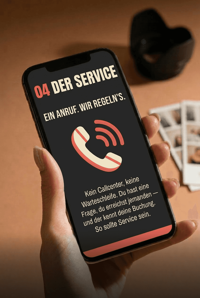 Du rufst an, jemand geht ran — und kennt deine Buchung. Kein Callcenter.